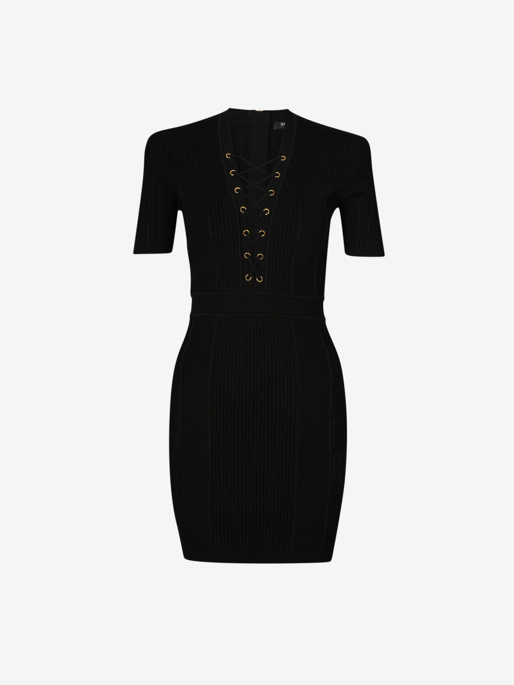 • Cuello en V adornado con un lazo, ojetes metálicos dorados